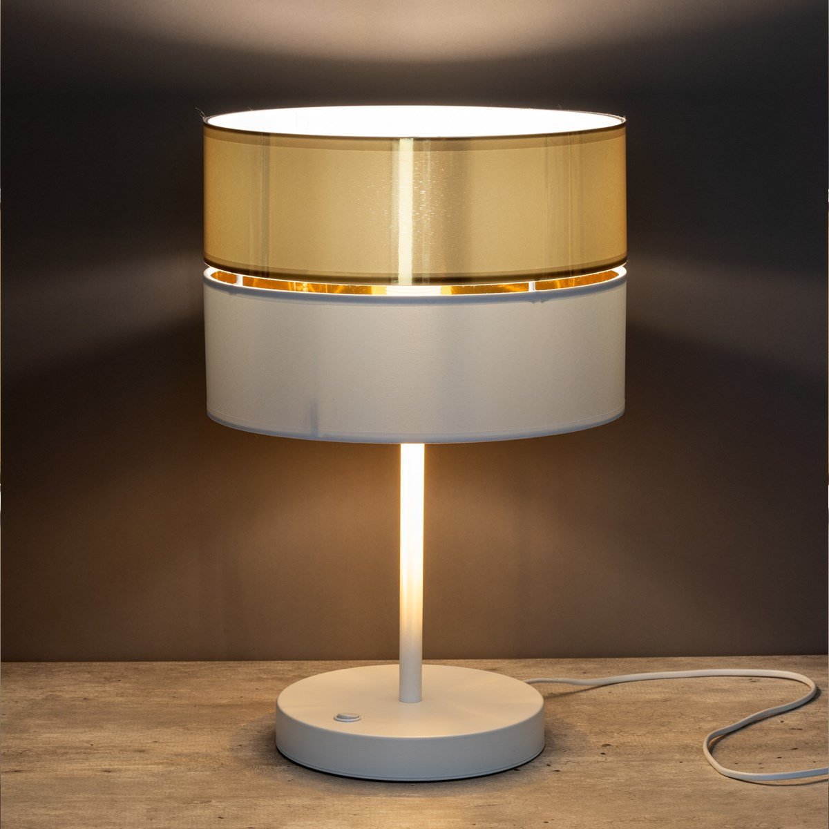 Introducing the mesmerising HILTON lamp collection by TK Lighting, in which white meets gold in a captivating fusion [1][2]. These lamps feature a truly unique design, with two shades connected by a centimetre-long gap. During the day this gap serves as a decorative element, but it is when the light is switched on that the magic really unfolds. Soft light gently shines through the gap, creating a radiant halo on the ceiling or walls.